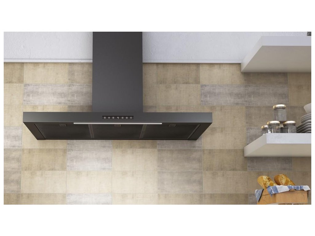 Komínová (nástěnná) digestoř nadčasového tvaru obráceného písmene T vybavená výkonným motorem s nízkou spotřebou elektrické energie.Tělo odsavače par je vyrobeno z černě stříkané oceli. Tvar digestoře nabízí možnost využití horní části jako odkládacího prostoru.Komínová digestoř je vybavena kovovými tukovými filtry v černém provedení, které nabízí vysoce účinné filtrování mastnot, není třeba je měnit a lze je jednoduše umýt v myčce nádobí.Dotykové TSE ovládání umožňuje snadnou údržbu povrchu odsavače par. Digestoř disponuje 3 rychlostmi a funkcí intenzivního odsávání, automatickým režimem regulujícím stupeň výkonu, časovačem a signalizací nasycení filtrů.Osvětlení digestoře je zajištěno LED páskem se světelným spektrem podobným dennímu světlu (4000 K). LED osvětlení kombinuje vysoký výkon (107 Lux) s nízkou spotřebou energie.Odsavač je standardně dodáván v odtahové verzi, součástí základní výbavy digestoře je černý teleskopický komín a zpětná klapka, v případě recirkulačního provozu je nutné k digestoři dokoupit uhlíkový filtr.Záruka na funkční díly 5 let.Doplňkové parametry