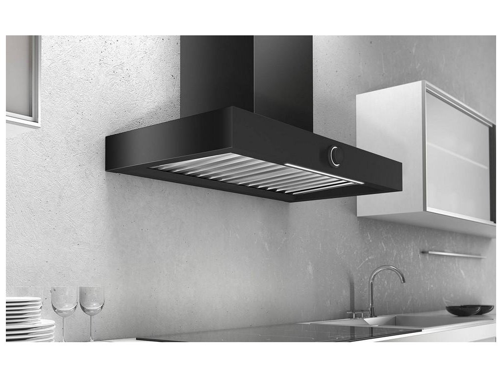 Komínová (nástěnná) digestoř nadčasového tvaru obráceného písmene T vybavená výkonným motorem s nízkou spotřebou elektrické energie.Tělo odsavače par je vyrobeno z černě stříkané oceli. Tvar digestoře nabízí možnost využití horní části jako odkládacího prostoru.Digestoř je vybavena speciálními tukovými BAFFLE filtry z nerezové oceli, které se vyznačují profesionálním vzhledem a velmi vysokou filtrační schopností. Využívají speciální labyrintový systém pro zachycení tukových částic obsažených v kuchyňských parách. Lze je mýt v myčce nádobí, čímž se zachová jejich bezchybná funkce. Speciální elektronické otočné ovládání digestoře nabízí možnost plynulé regulace výkonu digestoře.Osvětlení digestoře je zajištěno LED páskem se světelným spektrem podobným dennímu světlu (4000 K). LED osvětlení kombinuje vysoký výkon (100 Lux) s nízkou spotřebou energie.Odsavač je standardně dodáván v odtahové verzi, součástí základní výbavy digestoře je černý teleskopický komín a zpětná klapka, v případě recirkulačního provozu je nutné k digestoři dokoupit uhlíkový filtr.Záruka na funkční díly 5 let.Doplňkové parametry