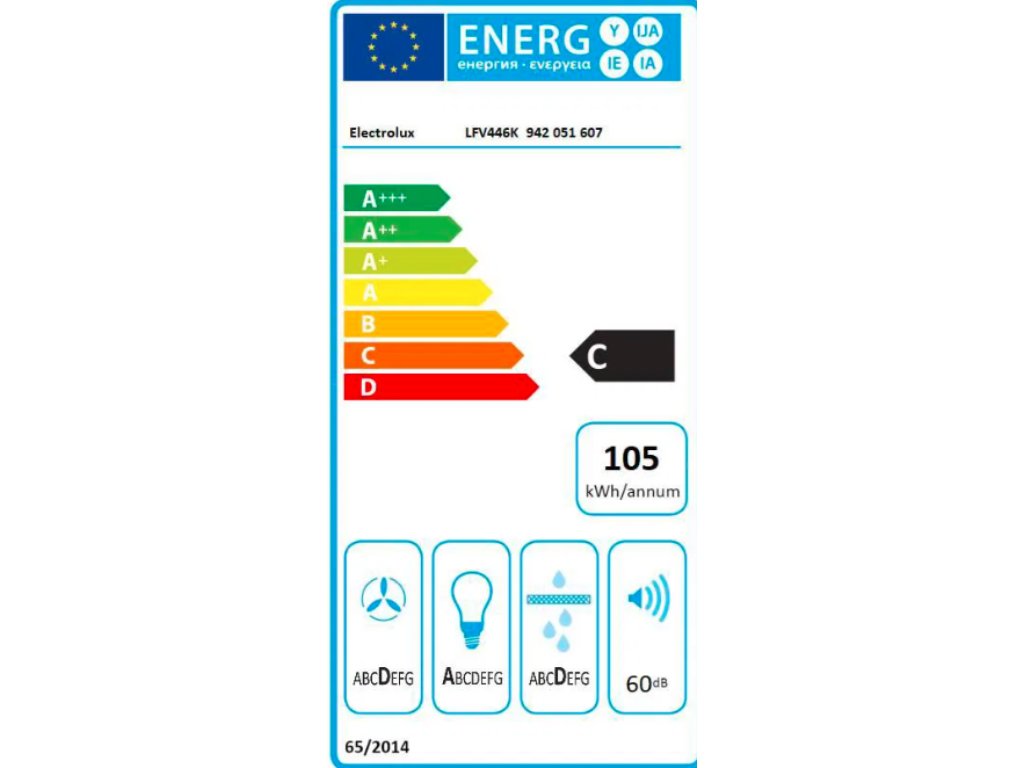 Roční spotřeba energie 105 kWh/annum Třída účinnosti proudění vzduchu D Třída účinnosti osvětlení A Třída účinnosti filtrace tuků D