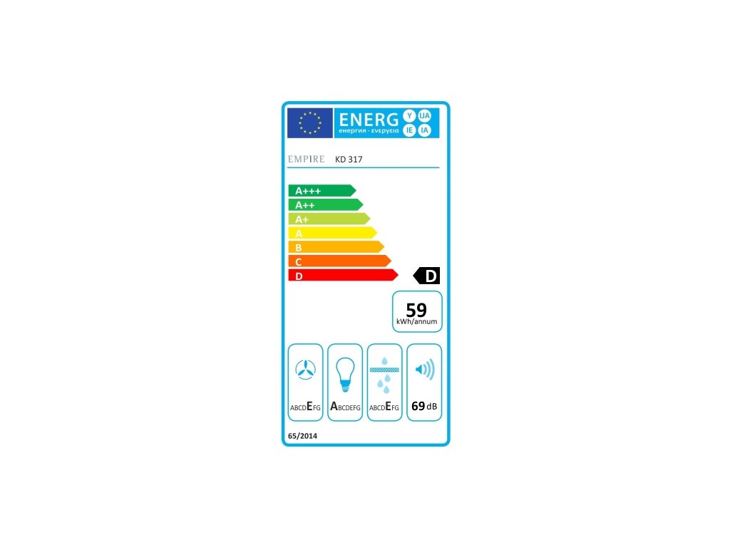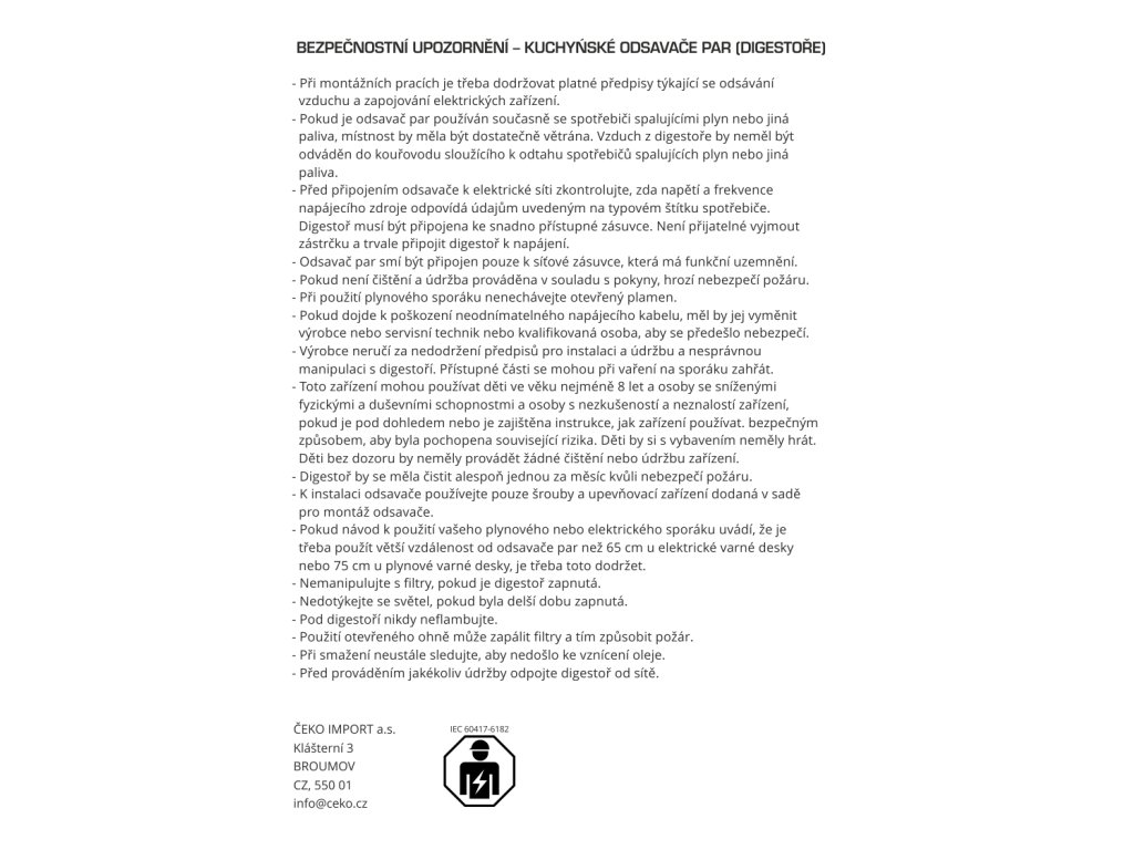 Komínová digestoř ke zdi, šíře 60 cm, nerez, max. výkon 410 m³/h (5 Pa), hlučnost Lw 48 – 69 dB(A), 3 rychlosti, odsávací jednotky mají individuálně vyvažovanou turbínu, motory jsou opatřené vratnými tepelnými pojistkami (při přetížení motoru vypne, po jeho vychladnutí opět sepne), mechanické tlačítkové ovládání, kovové sendvičové tukové filtry, které lze mýt v myčce, možnost práce v odtahovém i recirkulačním režimu, výstupní průměr 150 mm, Výbava: úsporné LED osvětlení 2 × 2 W, zdarma redukce na 120 mm a zpětná klapkaDoplňkové parametry