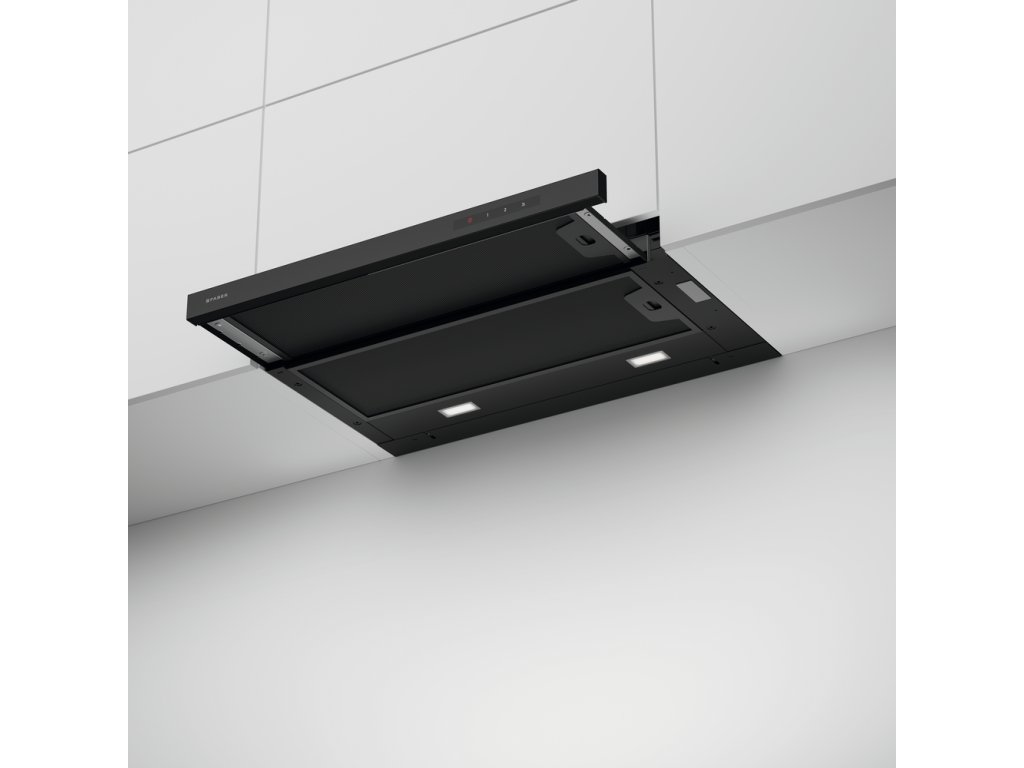 Tři stupně výkonu, funkci intenzivního odsávání nebo doběh po ukončení můžete pohodlně ovládat dotykovým ovládáním, které je umístěno na výsuvné liště. Zasunutím lišty se funkce automaticky deaktivují.