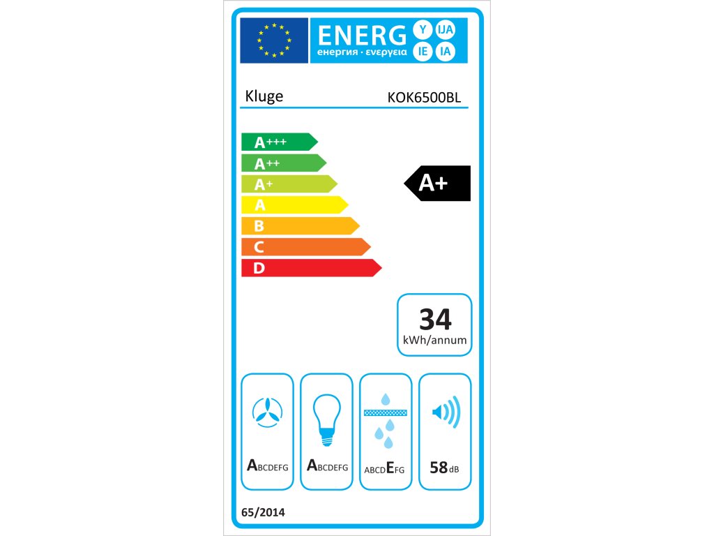 Komínový odsavač par KOK6500BL v elegantním černém matném provedení; Šířka 60 cm, výška panelu 8 cm; Ovládání gesty a dálkovým ovladačem; 3 stupně odsávání + Boost; Funkce HTH – automatické ovládání odsavače z varné desky; Funkce HTH (Hob to Hood) umožňuje propojení odsavače s varnými deskami vybavenými tímto systémem, po spárování odsavač automaticky upravuje výkon odsávání podle intenzity vaření, takže není nutné odsavač ručně nastavovat; Osvětlení 1× LED panel, 8 W s nastavením jasu a teploty světla; Výkon odtahu 170–405 m³/h, 660 m³/h v režimu BOOST; Hlučnost 39–58 dB(A), 68 dB(A) v režimu BOOST; Tukové hliníkové filtry a uhlíkový filtr pro recirkulaci (uhlíkové filtry FR-8705, 2 ks k dokoupení); Vysoká účinnost filtrace mastnot; Možnost výškového nastavení; Energetická třída A++; Roční spotřeba energie 34 kWh; Rozměry (V׊×H): min. 77,0 – max. 95,5 × 59,9 × 49,8 cm