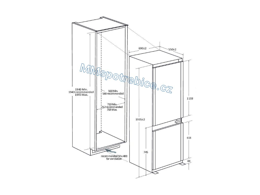 Velký prostor ve vestavěné chladničce - Ve srovnání se standardní vestavnou lednicí pro spodní montáž o výšce 177 cm x 55 cm šířce nabízí tato nová chladnička s rozměry 193 cm výška a 70 cm šířka o 50 % více prostoru v celé chladničky.
