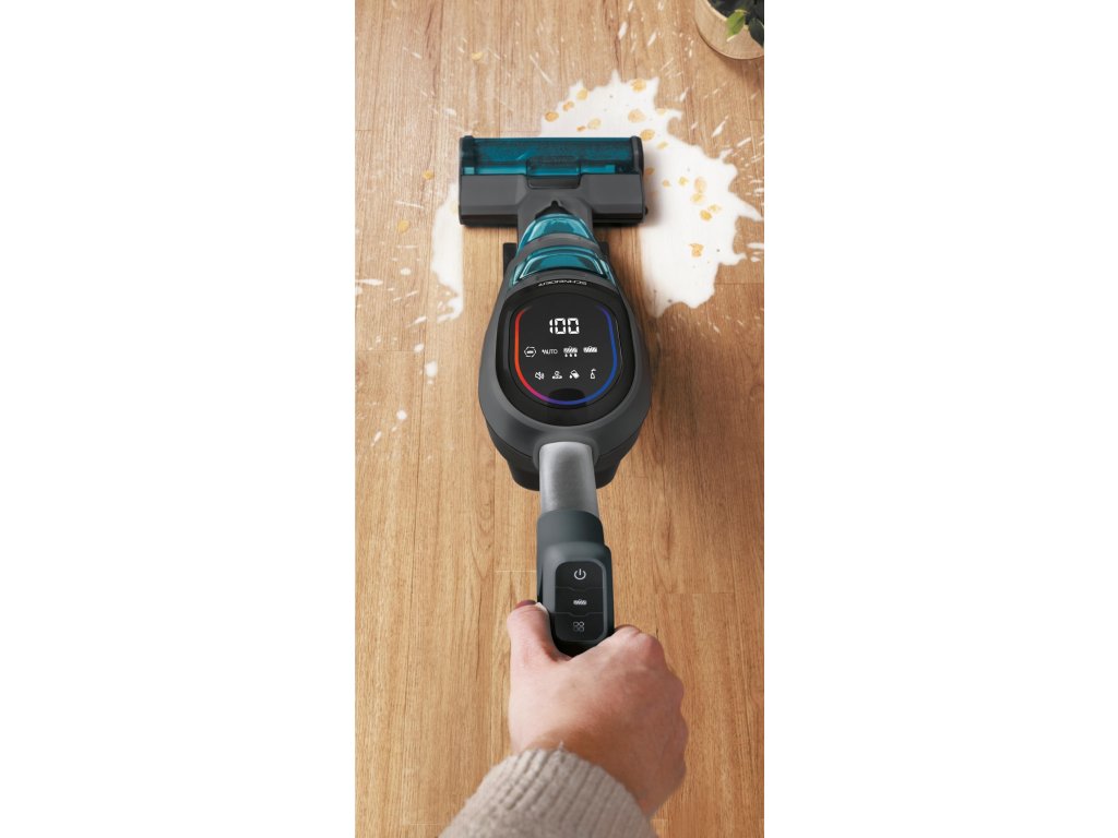 - LED displej zobrazující stav baterie a nádržku na vodu, sací výkon a režim čištění