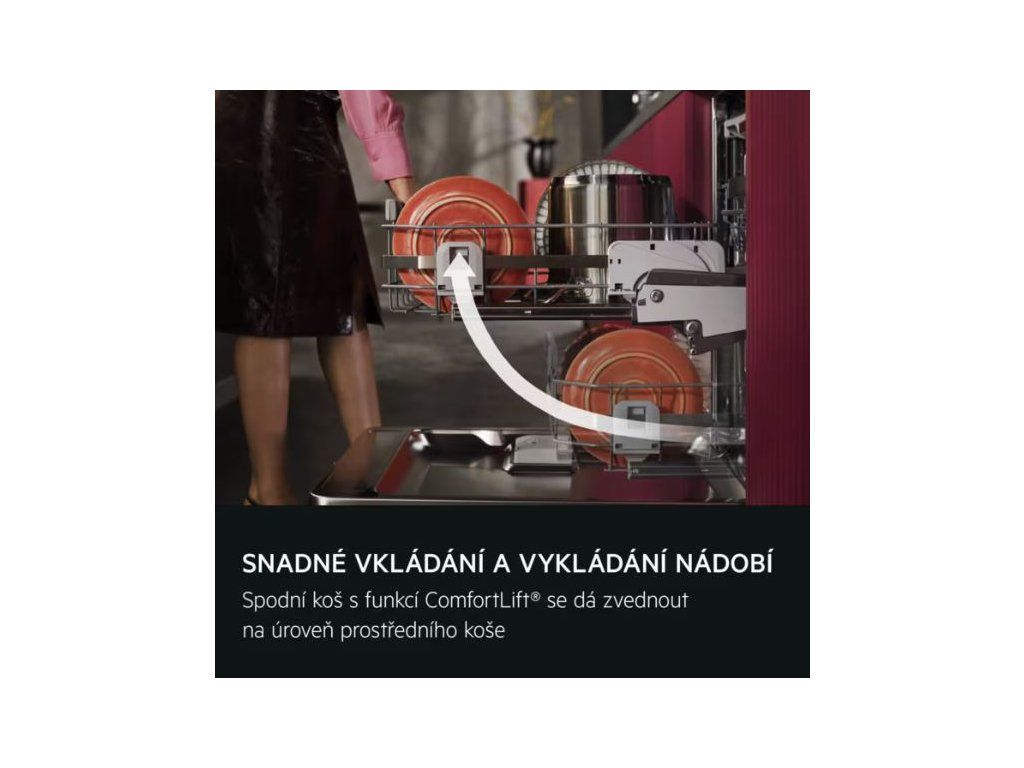 Díky systému ComfortLift® je vkládání i uklízení nádobí mnohem pohodlnější a snadnější. Nevyžaduje totiž ohýbání, které namáhá vaše záda. Proměňte péči o nádobí v komfortnější zážitek na vysoké úrovni. Stačí jemně stisknout rukojeť a dolní koš se zvedne směrem k vám.