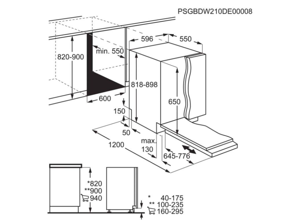Rozměry vestavné myčky na nádobí AEG jsou 81,5 × 59,6 × 55 cm (vך×h).