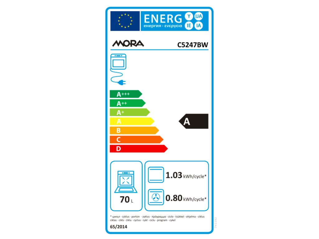 HiLight varné zóny vlevo vpředu Ø 18 cm 1,7 kW vpravo vpředu Ø 14,5 cm 1,2 kW vlevo vzadu Ø 14,5 cm 1,2 kW vpravo vzadu Ø 18 cm 1,7 kW ukazatel zbytkového tepla varných zón multifunkční trouba – 8 způsobů ohřevu ECO CLEAN – funkce na čištění trouby rychlý předehřev trouby program PIZZA program pro HOTOVÁ A MRAŽENÁ JÍDLA regulace teploty v troubě 50–275 °C osvětlení trouby objem trouby 70 l vedení v troubě – drátěná vodítka plechů výsuvné teleskopické rošty/1 úroveň tlumené dovírání dvířek chladná dvířka trouby energetická třída – A praktický úložný prostor příslušenství: 1 x rošt, 1x XXL hluboký pekáč rozměry spotřebiče (v x š x h): 85 x 50 x 59,4 cm jmenovitý příkon: 9 kW elektrické napětí: 400 V