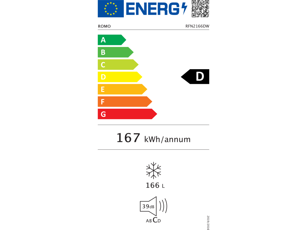 Mrazicí výkon dosahuje 7,6 kg za 24 hodin a v případě výpadku elektrické energie udrží spotřebič vnitřní teplotu až 8 hodin. Mraznička spadá do energetické třídy D s roční spotřebou 167 kWh a hlučností 39 dB(A), což odpovídá běžnému provozu v domácím prostředí.