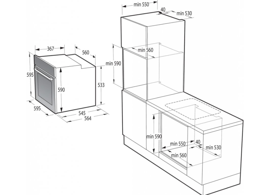 Vedení v troubě 59,5 cm Výška 56,4 cm