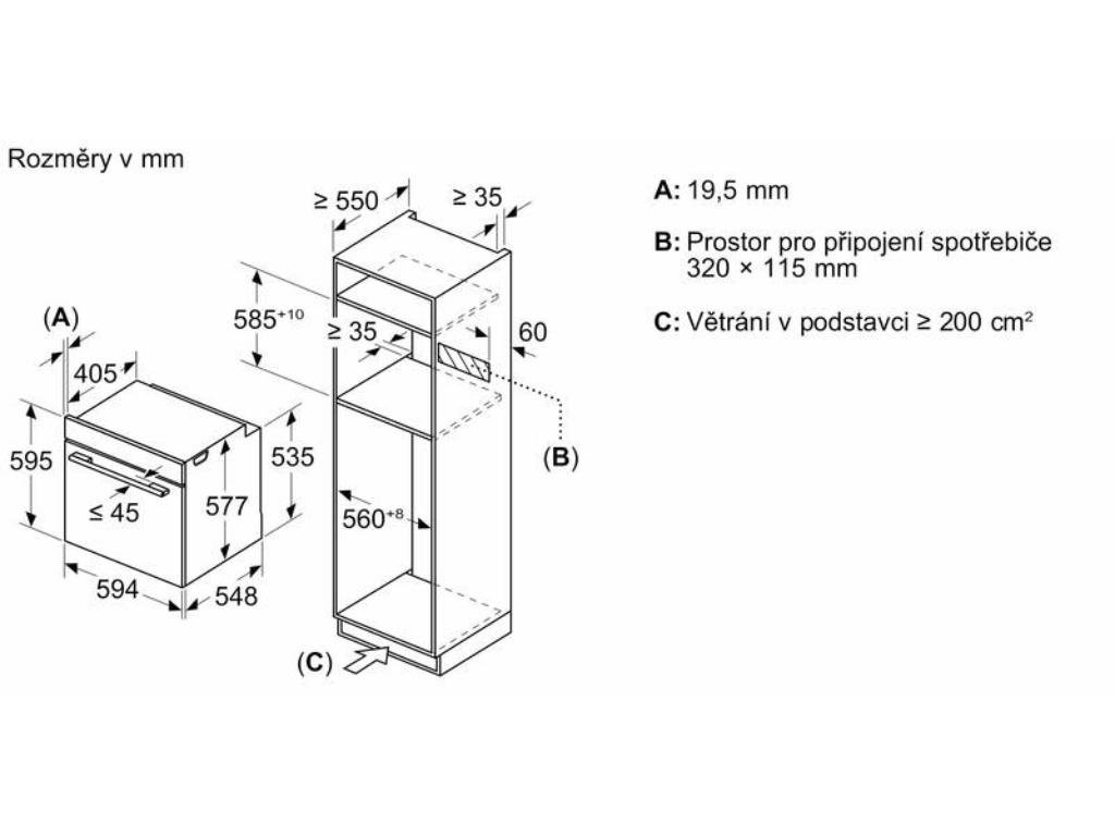 Rozměry rozměry spotřebiče (V x Š x H): 595 mm x 594 mm x 548 mm rozměry niky (V x Š x H): 585 mm - 595 mm x 560 mm - 568 mm x 550 mm