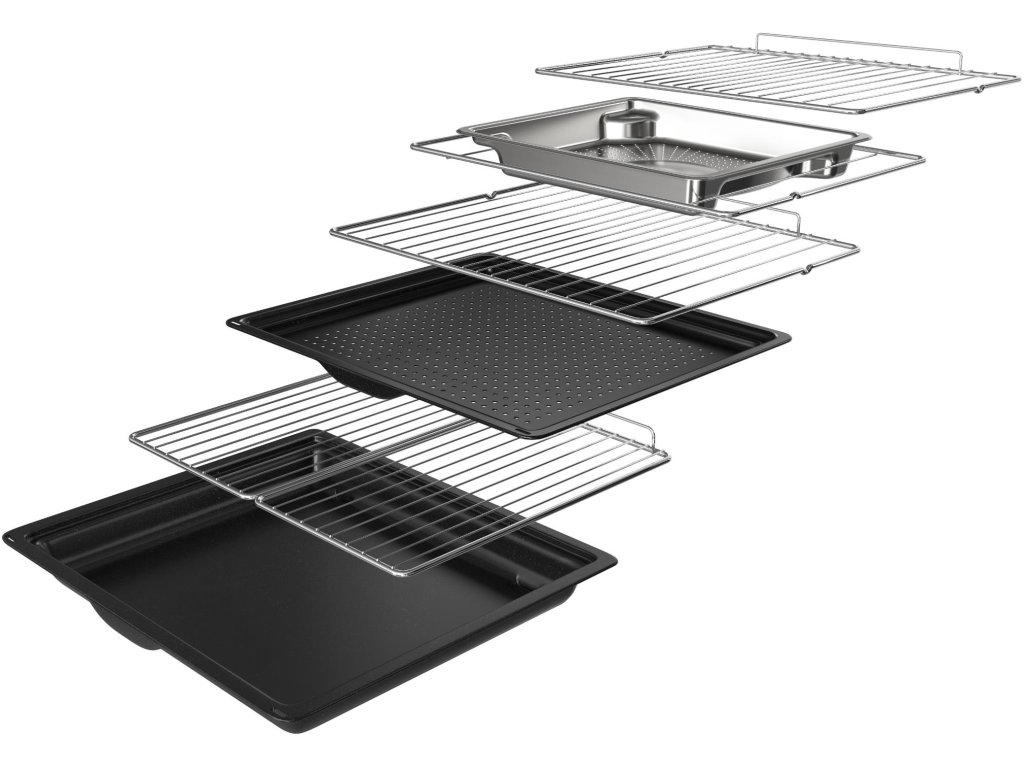 - Příslušenství: Boční rošty, 100% teleskopický výsuv, 2 plné a 2 poloviční rošty, mělký a hluboký plech, 1 plech pro parní pečení, 1 perforovaný plech pro Sušení a Air Fry