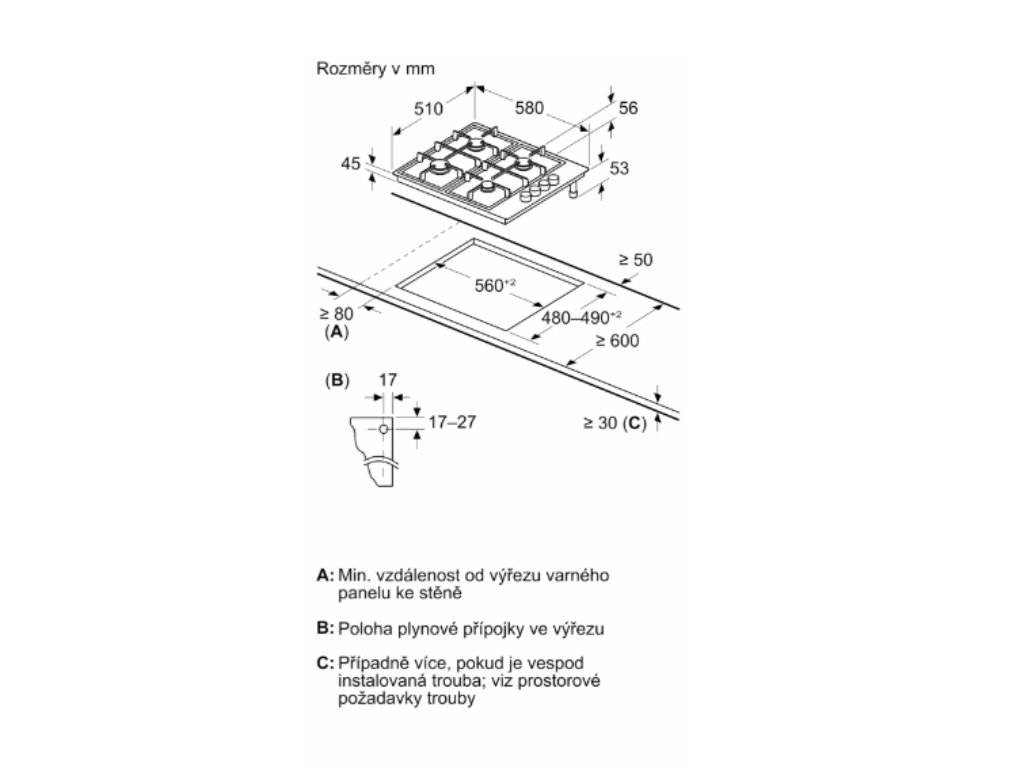 Požadovaná velikost otvoru pro instalaci (v x š x h) 45 x 560-560 x 480-490 mm