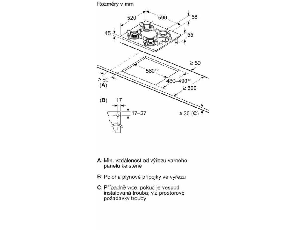 Instalace (dle typu plynu) rozměry spotřebiče (V x Š x H): 54.5 x 590 x 520 mm rozměry pro vestavbu (V x Š x H) : 45 x 560 x 480 - 490 mm min. tloušťka pracovní desky: 20 mm při instalaci do roviny pracovní desky je minimální tloušťku desky 30 mm délka připojovacího kabelu: 1 m celkový objem připojeného plynu: 7.8 kW