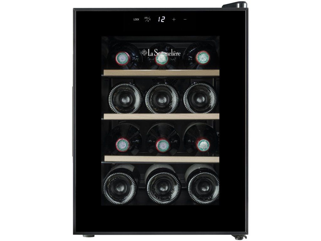 Vinotéka La Sommelière 12SILENCE přináší kompaktní řešení pro servírovací teplotu až 12 lahví Bordeaux 0,75 l v provedení, které působí čistě a nerušivě. Displej v bílé barvě. Hybridní technologie chlazení bez ventilátoru v kombinaci s hlučností pouhých 25 dB podtrhuje její diskrétní provoz, zatímco elektronická regulace s externím digitálním panelem a nastavitelným rozsahem 11–18 °C umožňuje přesné nastavení podmínek uvnitř spotřebiče. Vnitřní prostor doplňují 3 ocelové drátěné police s čelní lištou z přírodního dřeva, LED osvětlení s vypínačem v bílé studené barvě, paměť nastavení teploty, teplotní alarm a antivibrační systém. Celkový výraz uzavírají celoskleněné dveře v černém provedení s integrovaným madlem a 3vrstvým tvrzeným sklem. Energetická třída F. Spotřeba energie 85 kWh/rok. Rozměry (VxŠxH) 47,9 x 34,5 x 51 cm.