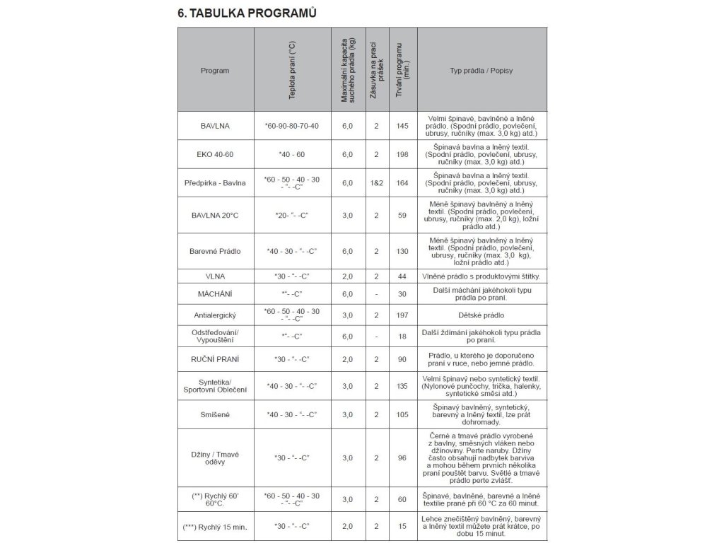 | Programy praní: | Bavlna, Bavlna s předpírkou, Vlna, Ruční praní, Máchání, Bavlna 20°, Odstředění + vypouštění, Antialergický, Džíny / Tmavé oděvy, Rychlý 60', Barevné prádlo, Eco 40-60, Rychlý 15', Mix, Sportovní |