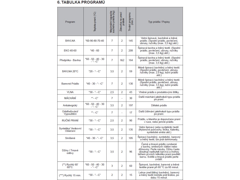 | Programy praní: | Vlna, Ruční praní, Sportovní oděvy, Bavlna, Bavlna s předpírkou, Máchání, Bavlna 20°, Odstředění + vypouštění, Antialergický, Džíny / Tmavé oděvy, Rychlý 60', Barevné prádlo, Eco 40-60, Mix, Rychlý 15' |