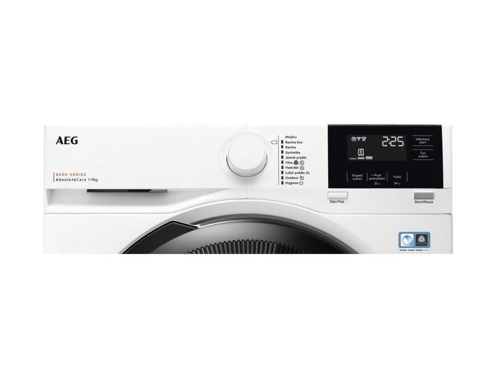 Sušička AEG TR819P4C 8000 AbsoluteCare® s technologií tepelného čerpadla nabízí šetrné sušení vlny, hedvábí i outdoorového oblečení, program MixDry bez nutnosti třídění, hygienický program s certifikací Swissatest, úsporné senzory PreciseDry a rovnoměrné sušení SensiDry® při nízkých teplotách.