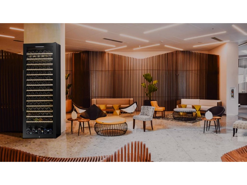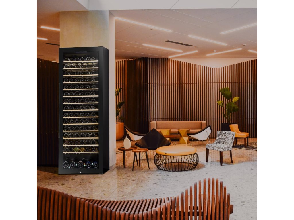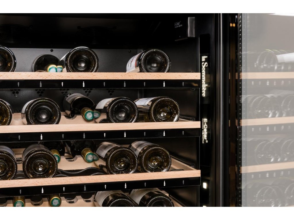 Vinotéka ECELLAR185 má kapacitu 185 lahví a díky elektronickému termostatu a přehlednému digitálnímu displeji je možné vnitřní teplotu regulovat v rozmezí 5 až 20 °C. Prosklené dveře s černým rámem a černým madlem jsou vybaveny 3 vrstvami zatmaveného tvrzeného skla s UV filtrem. K dispozici je bílé LED osvětlení vnitřku s vypínačem. Vína můžete uskladnit na celkem 14 výsuvných dřevěných smart policích s LED indikací lahví.